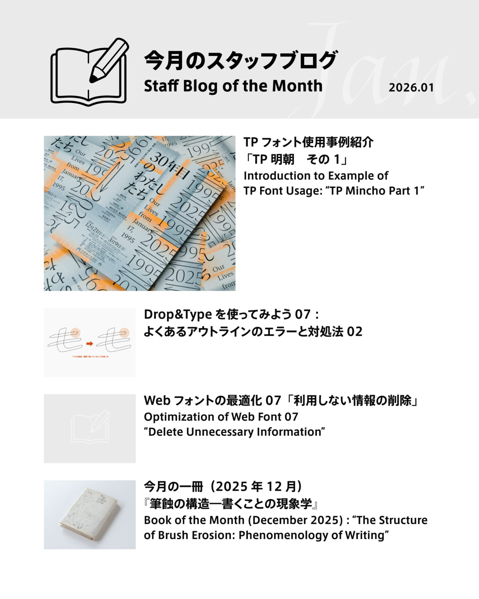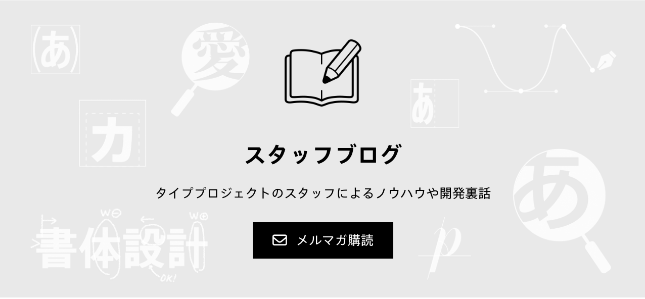 これからも書体デザインに関わるさまざまなトピックをスタッフ目線でお届けしていきますので、引き続きお楽しみいただければ幸いです。
