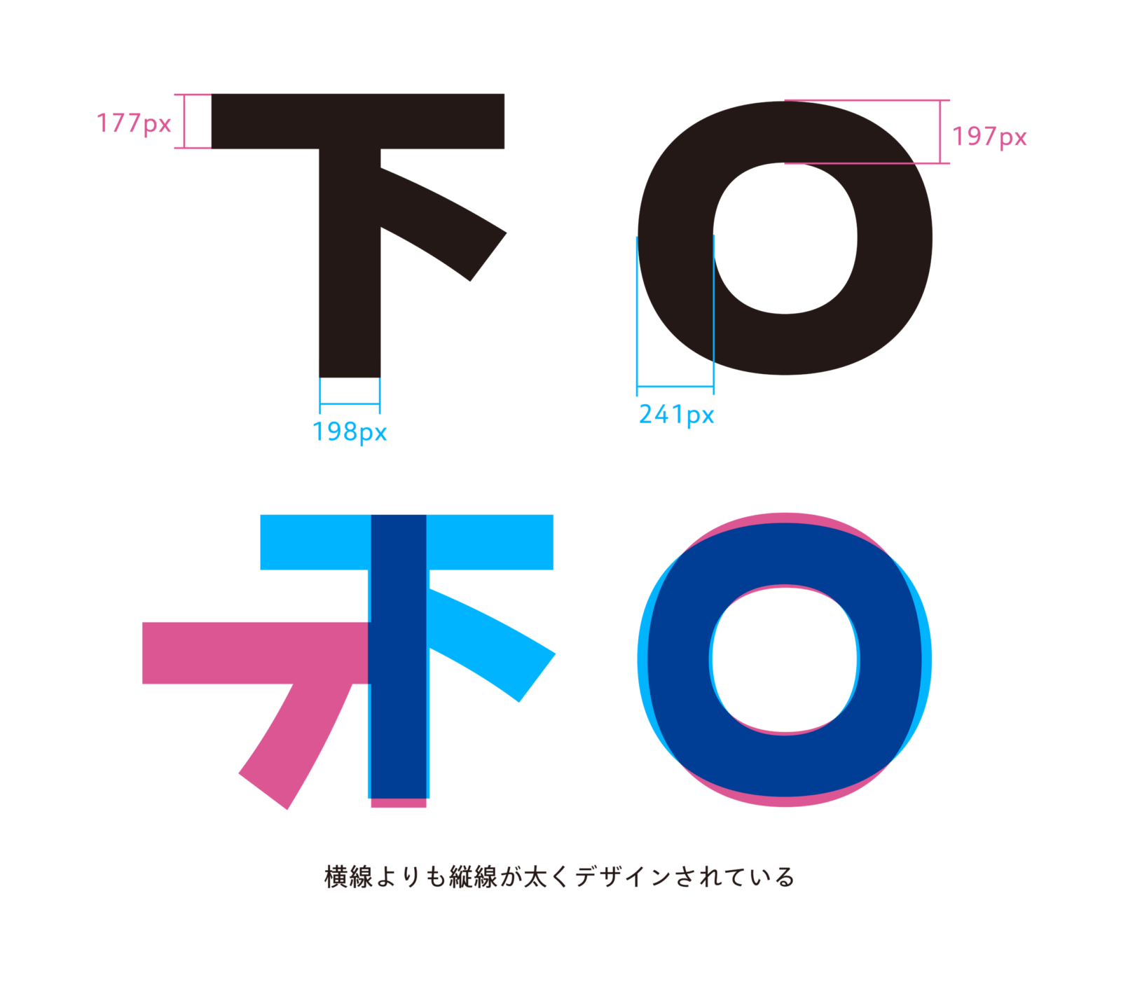 文字デザインでも、縦方向の線を太めにすることで安定した形に見えるようになります。 下の図のように、漢字の「下」やアルファベットの「O」などで縦方向の線の方が数値的に太くデザインされていることがわかります。