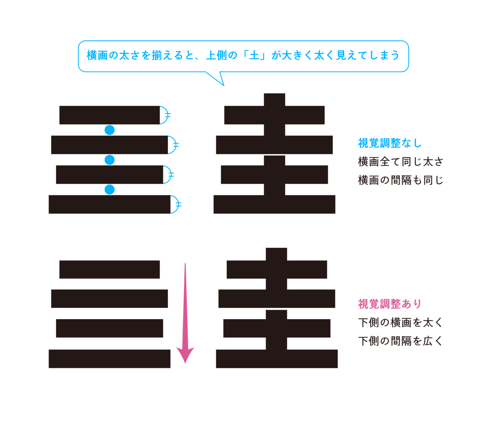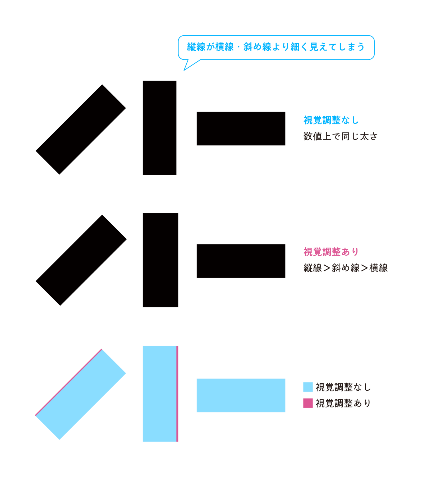 1つの文字の中で同じ方向の線がいくつも並んでいる場合に、全ての線を同じ太さにしてしまうと文字としてバランスの良い形に見えません。