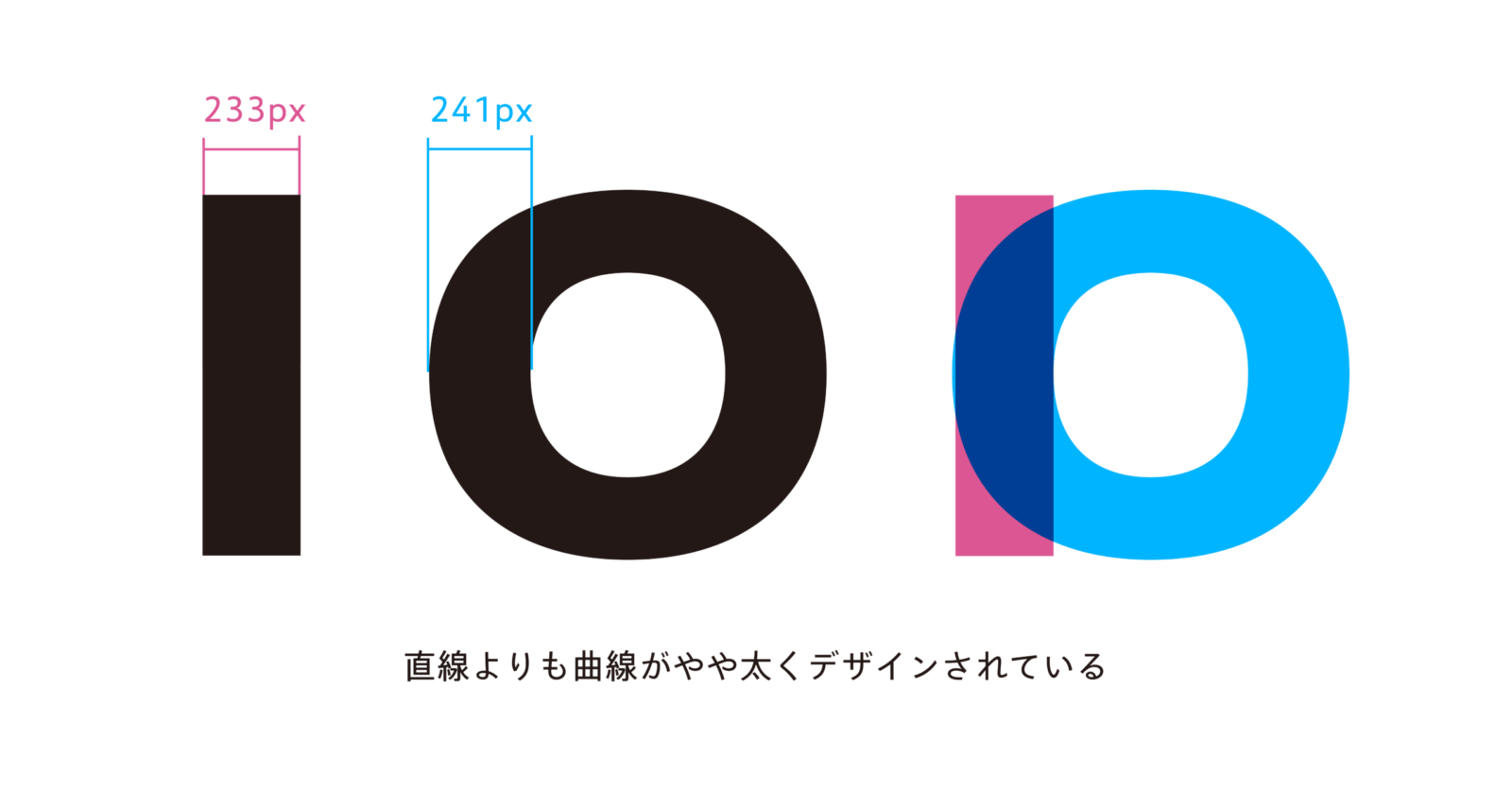 2つ目のポイントは「曲線を直線より太く」です。 直線と曲線では曲線の方をやや太くすることで全体のトーンを揃えることができます。欧文の「I」と「O」などを見てみると、この調整がされていることがわかります。