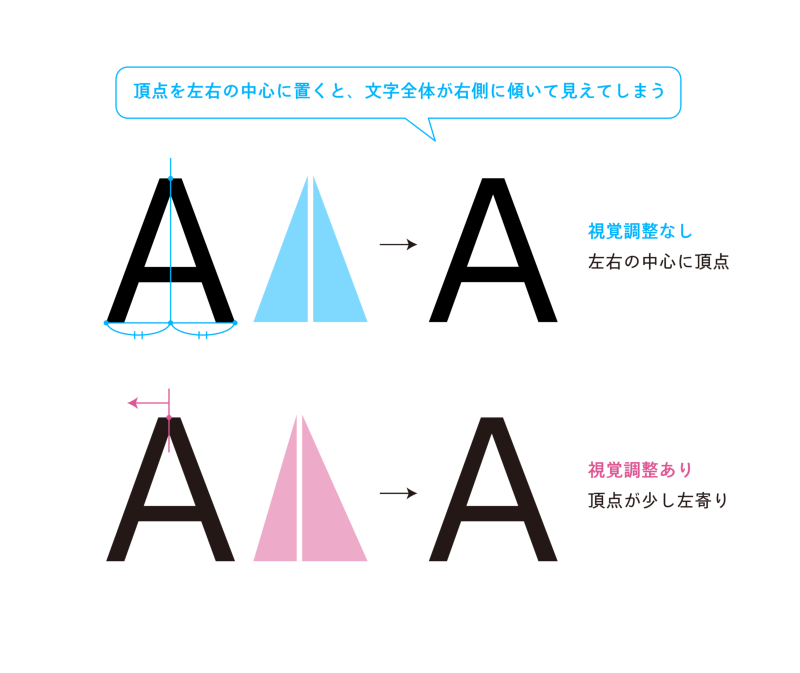 少し応用的な調整の例ではアルファベットの「A」が挙げられます。「A」の三角形の上の頂点の位置は、下の2つの頂点を結ぶ線の中心よりも少し左に寄っています。これは、ちょうど真ん中に頂点を置くと、右に傾いて見えてしまうためです。頂点をずらし、黒い部分と白い部分の両方を含めた、文字全体の右側を大きくすることで、人の目に左右対称の形に見えるように調整されているのです。