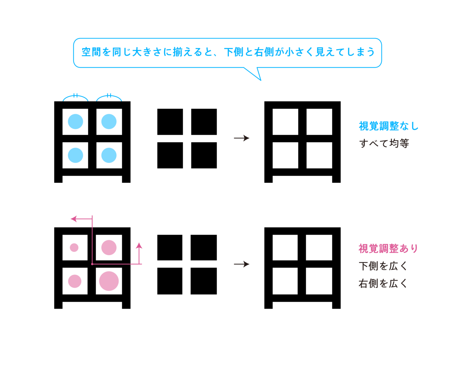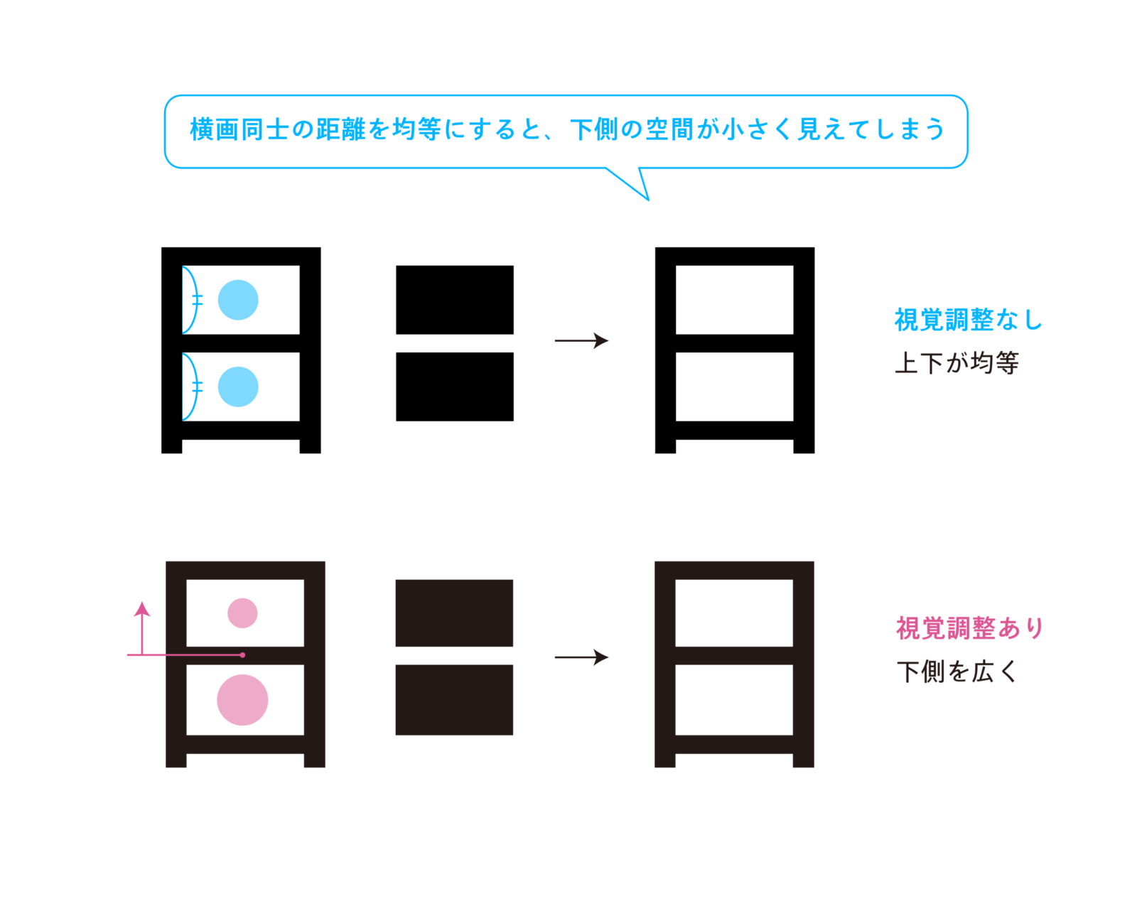 1つ目のポイントは「下側を広く」です。以前の記事でも人の目には上部のものが下部のものより膨張して見える点について触れました。この錯視は、描く図形の形状だけでなく、空間の大きさについても同じように起こります。そのため、文字を構成する線の周りの空間も、上側よりも下側を広く取ることでバランスの取れた文字の形にすることができます。
