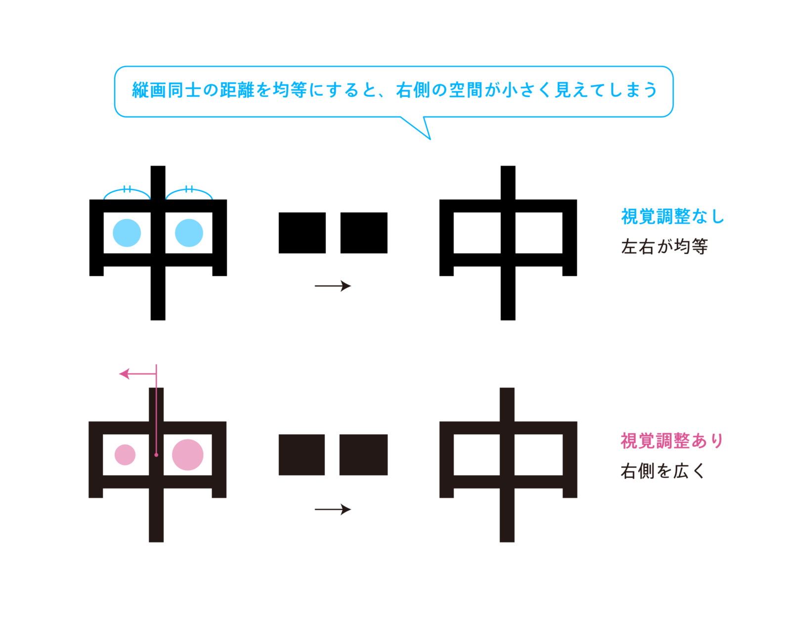 文字の内側の空間(フトコロ、もしくはカウンター)について漢字の「日」の例を見てみましょう。「日」の真ん中の横線と、上下の横画との距離を数値的に揃えると、下側の白い空間の方が上側の空間よりも小さく見えてしまいます。真ん中の横線を少しだけ上寄りの位置に置き、下側の空間を大きくすることで、見たときに安定感のあるバランスの取れた文字の形になります。