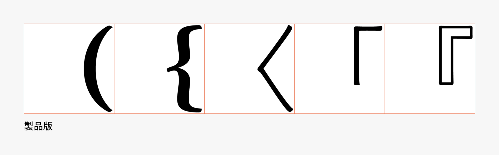 最終的には漢字寄りと図形寄りを使い分けるようにして和文括弧類のデザインをまとめました。ある程度振れ幅を持たせて3つのデザイン案を作ったことにより、3つの案の間のどの辺りにゴールがあるのかが捉えやすくなりました。もちろんそれまでの制作による慣れも大きいと思いますが、和文括弧類の制作はスムーズに進んだと感じています。さらにこの後で続く記号類でもこのデザイン方針は活きてきます。