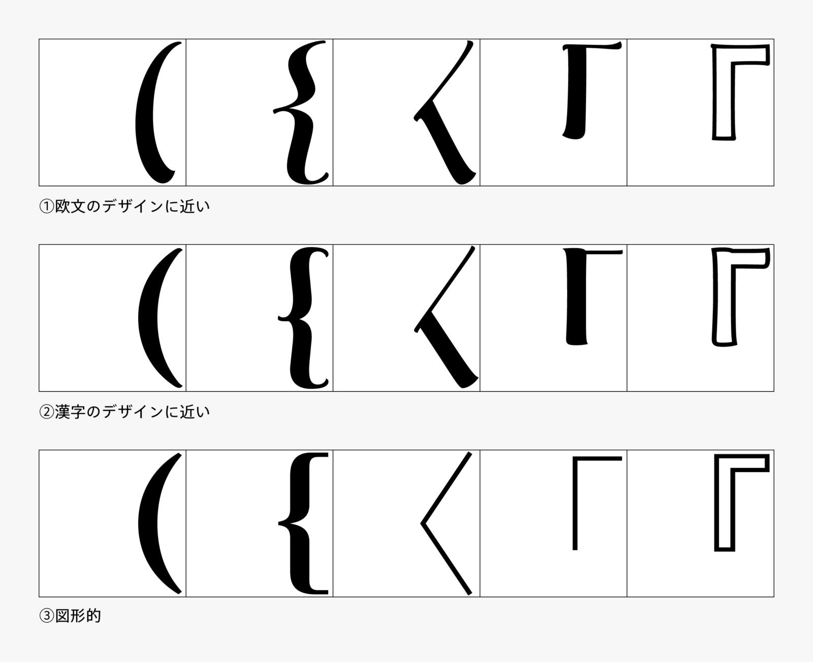 ひらがなのデザインで紆余曲折を経験したこと(今後の記事で詳しく紹介します)から、和文括弧類は最初の試作で3つのデザイン案を作りました。1つ目は欧文のデザインに近いもの、2つ目は漢字のデザインに近いもの、3つ目は図形的なものです。