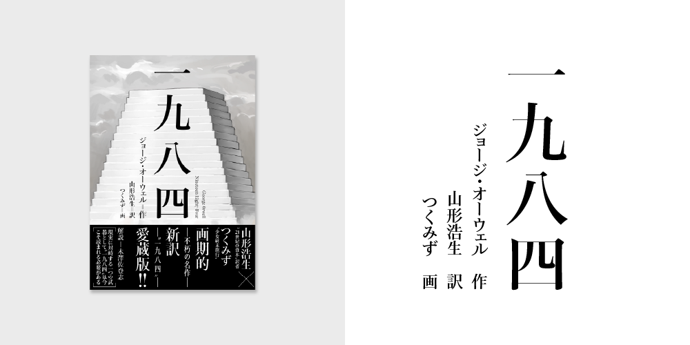 装画は漫画家のつくみず氏によるもので、暗雲が垂れ込める中にそびえる大きな白い塔のような建造物を背景に、タイトル「一九八四」が中央に大きく象徴的にレイアウトされ、不穏な気配を漂わせています。