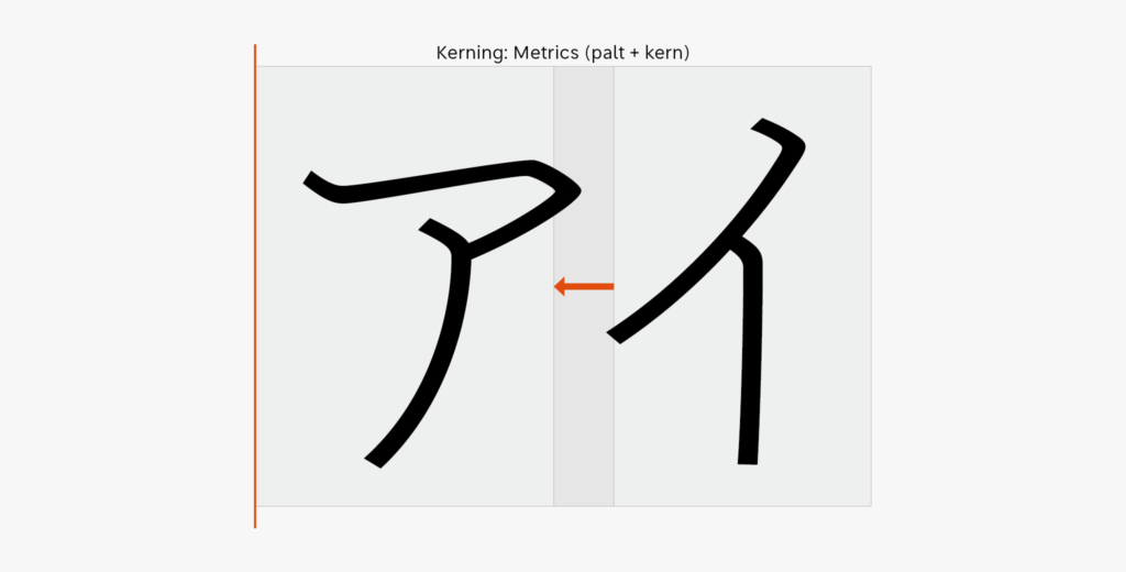 Metrics kerning is kerning based on information inside the font (set in advance by the font maker). In Japanese metrics kerning, the value is set on the assumption that proportional metrics are already applied. As Latin is originally proportional, it is possible to apply kerning directly. In the case of Japanese, a two-stage procedure is required: make it proportional first, and then adjusting the spacing between specific characters by kerning. Without proportional metrics, metrics kerning cannot be applied.