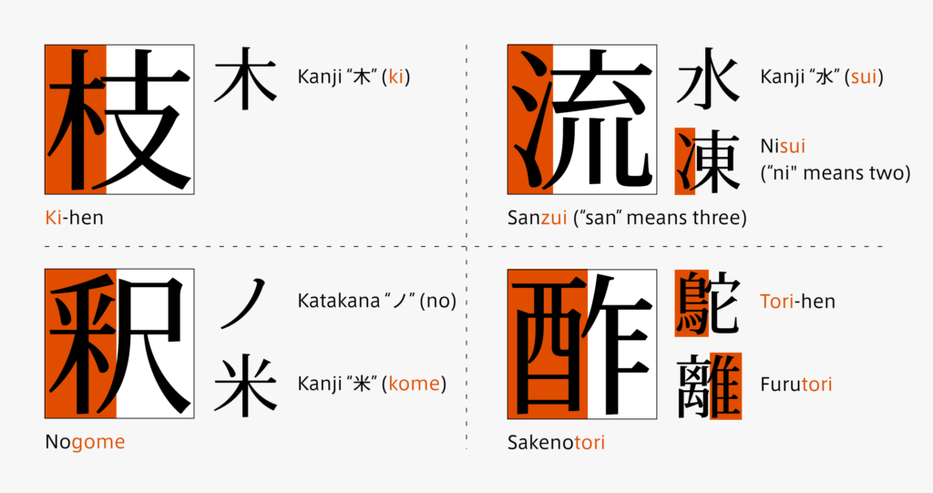 What are the common names for each radical? Apart from those in which the original kanji names are used as they are, such as “ki-hen, take-kanmuri, mon-gamae,” etc., there are names with a twist, such as “sanzui.” For example, radicals such as “nogome,” used for “釈, 釉, 釋,” etc., and “rumata,” used for “段, 穀, 殿,” etc., are common names of the elements disassembled. In “sakenotori, hiyominotori,” used for “酢, 酔, 酵,” and “renga/rekka,” used for “照, 熱, 然,” differentiation is made as to avoid names that may overlap. “Kozato,” used for “限, 防, 階,” and “oozato,” used for “部, 都, 郡” are the same shape but have different common names. This is because the original characters are different.
