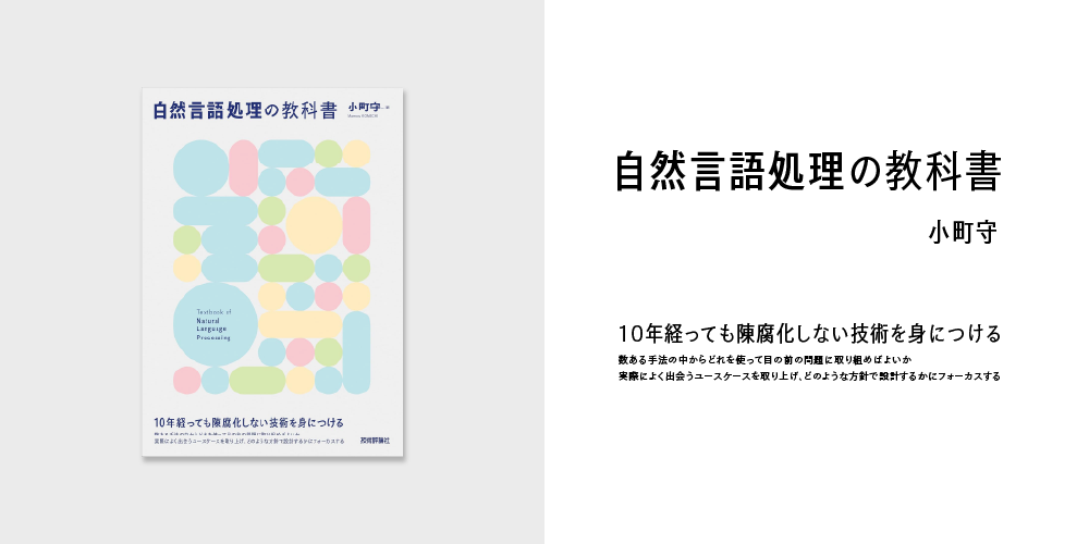 This book compiles fundamental knowledge on natural language processing; TP Gothic Condensed is used in the title, for the name of the author, and catch phrase. The design features striking geometric shapes in pale blue, red, green, and yellow. Combined with a light gray background, the overall pastel tone creates a light and gentle impression, conveying an “approachable feel.” By using Condensed instead of Regular and slightly widening the space between characters, an impression that feels weightless is emphasized. Furthermore, the weights in “Textbook of” and “Natural Language Processing” of the title are varied to create emphasis, naturally guiding the gaze. Despite its simple structure, the rich expression of TP Gothic, including serif in the beginning of each brushstroke and modulation in strokes specific to Gothic typeface, and the gouge of sweep adds an accent to the entire cover.