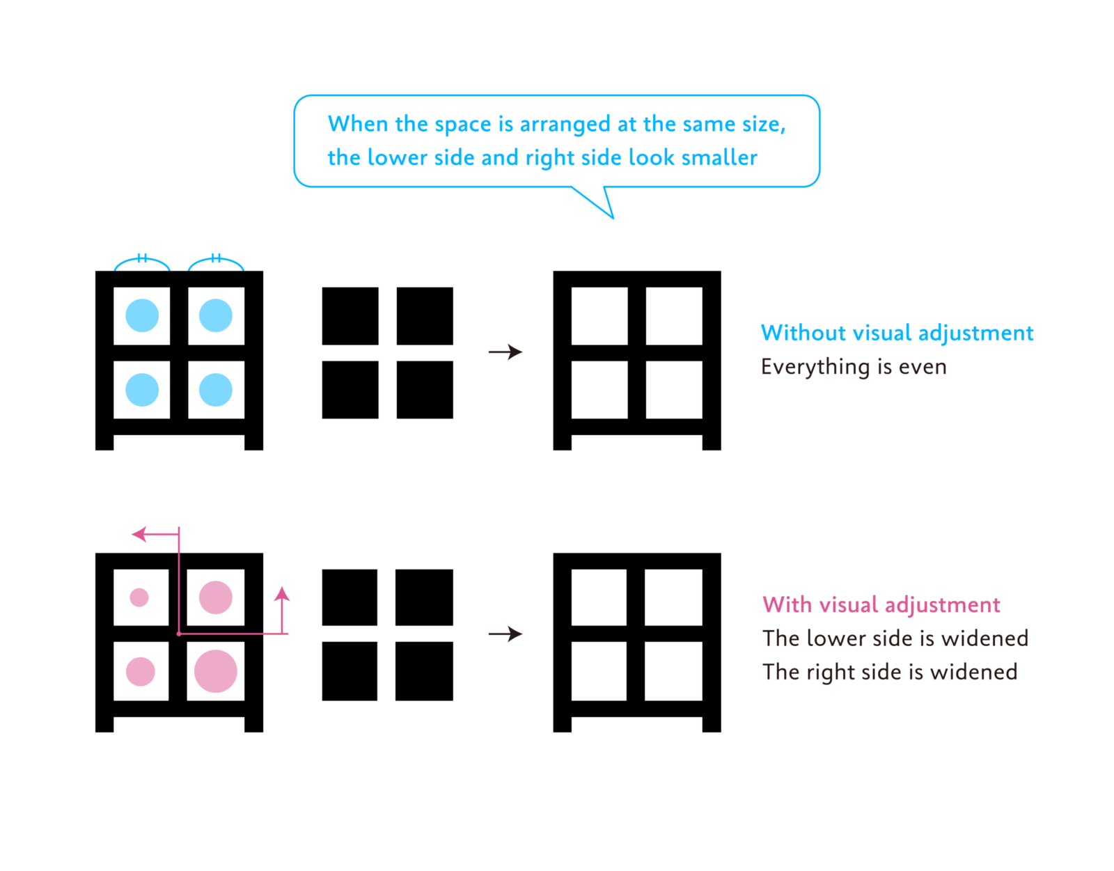The second point is “make the right side wider.” This is a principle similar to the first visual illusion on the upper and lower sides; as the left side looks more expanded than the right side to the human eye, it is necessary to adjust to widen the space on the right side.