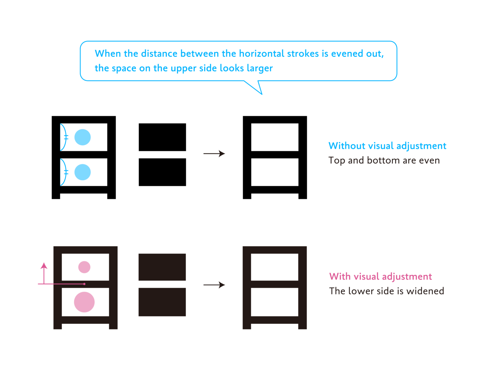 Let us look at the example of the kanji “日” to check the inner space within the character (inside space between strokes or counter). When the horizontal line in the middle of the character “日” is numerically evened out with the horizontal strokes on the top and bottom, the white space on the lower side looks smaller than the space on the upper side. Placing the horizontal line in the middle slightly higher and increasing the space on the lower side creates a stable, well-balanced character shape when viewed.