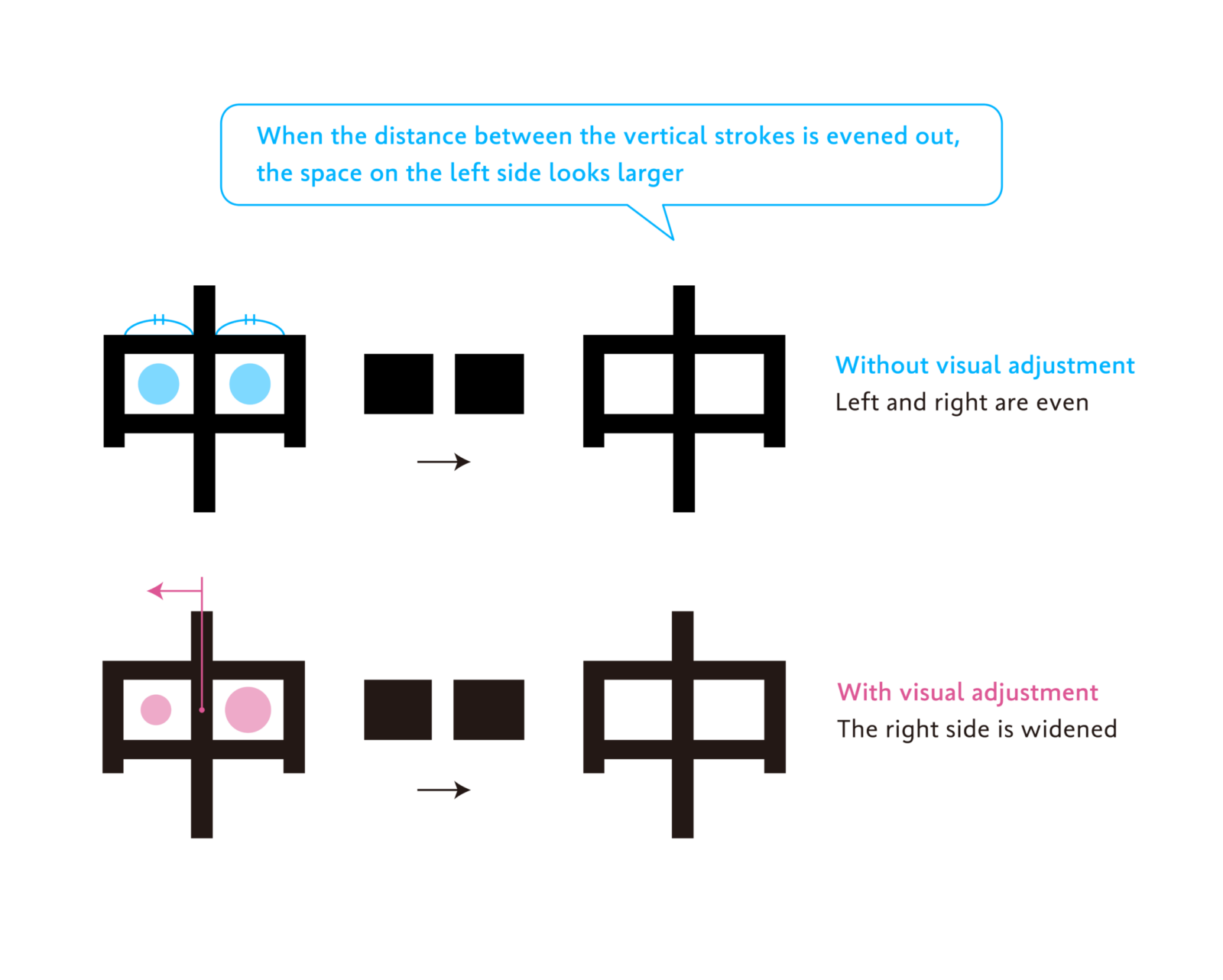 In the kanji “中” shown in the diagram below, the long vertical line in the middle is shifted slightly to the left of the numerical center of the left and right to create wider square space on the right side to achieve balance.