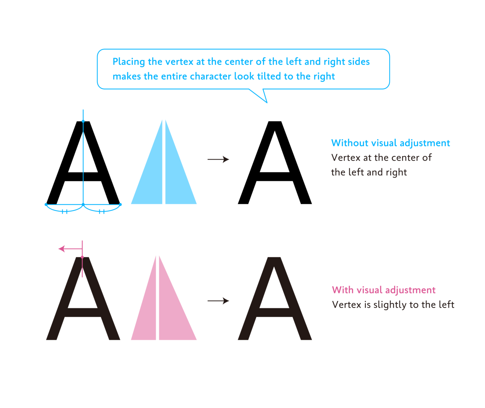 An example of a slightly more advanced adjustment is the letter “A.” The position of the top vertex of the triangle “A” is slightly shifted to the left of the center of the line connecting the two lower vertices. This is because placing the vertex in the middle makes it look tilted to the right. By shifting the vertex and making the right side of the entire character larger, encompassing both the black and white parts, it is adjusted to look symmetrical to the human eye.