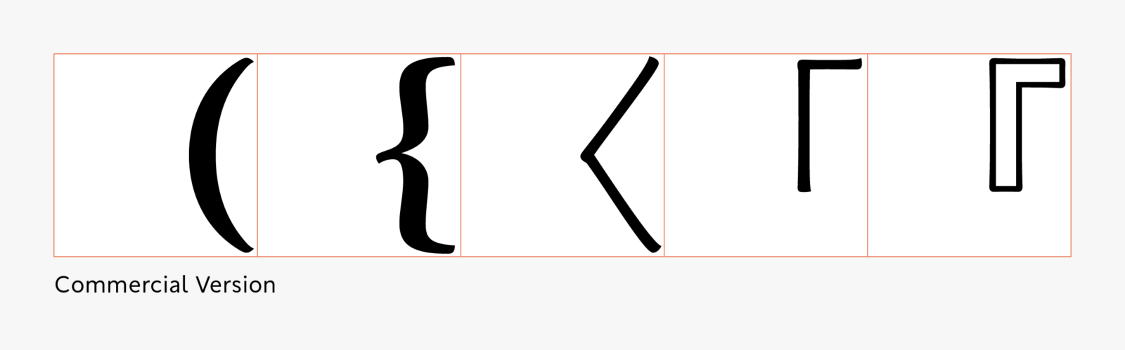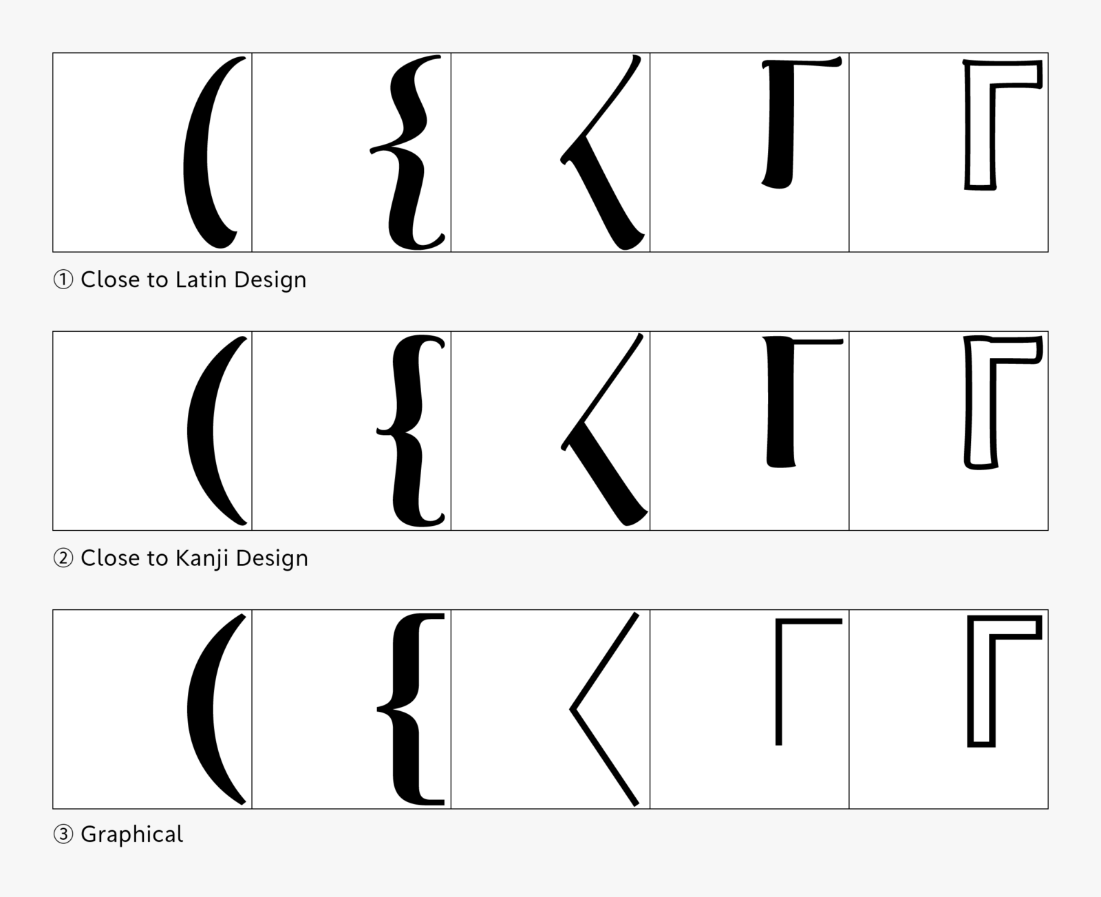 Because I experienced a lot of twists and turns with the hiragana design (this topic will be introduced in detail in a future article), I created three design proposals for Japanese brackets in the initial prototype. The first is close to Latin design, the second is close to kanji design, and the third is graphical.